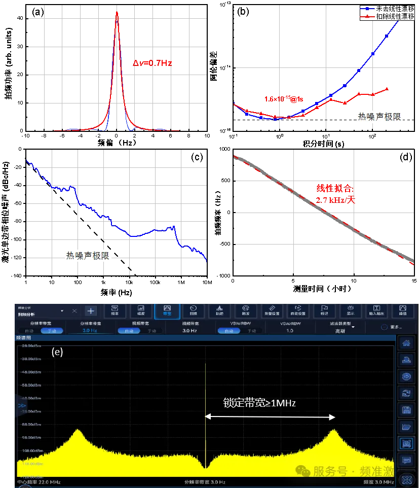 (d)激光频率漂移和(e)FP腔的PDH锁定带宽
